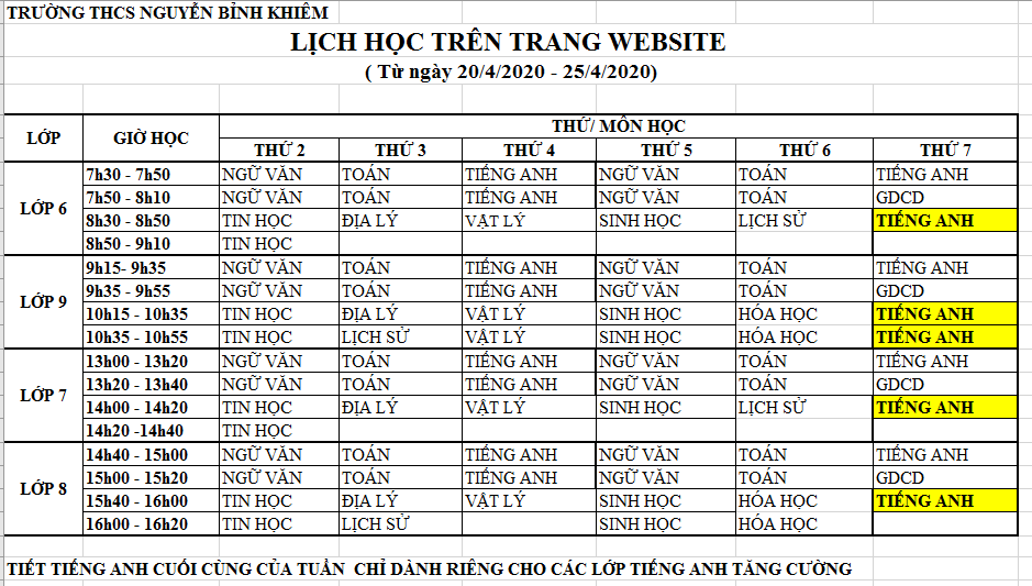 Quý Phụ huynh và các em Học sinh lưu ý: Tiết TIẾNG ANH thứ 7 ngày 25/04/2020 được tô màu VÀNG chỉ dành cho các lớp TĂNG CƯỜNG (61,62,71,72,81,82,91,92).