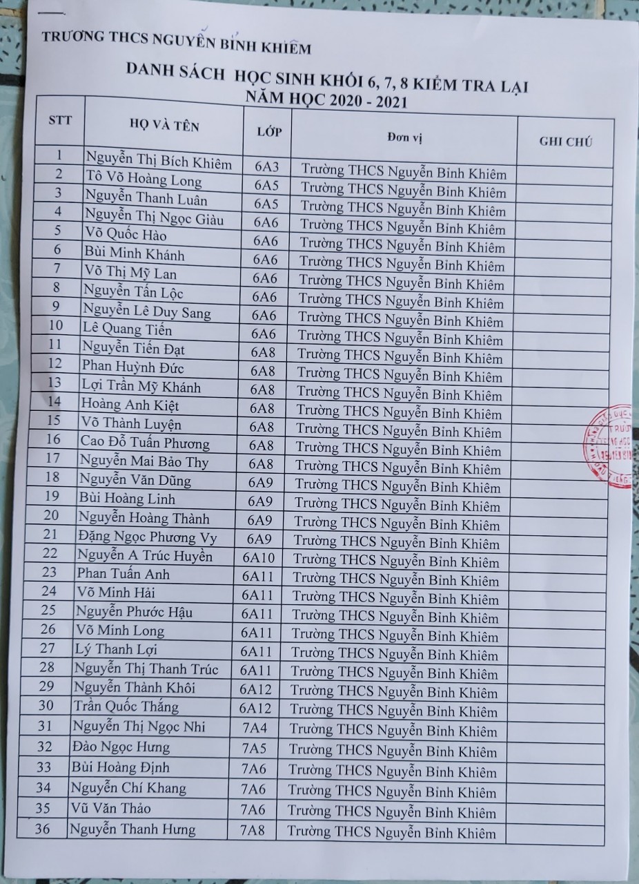 Trên đây là kế hoạch tổ chức kiểm tra lại năm học 2020 – 2021 của trường THCS Nguyễn Bỉnh Khiêm.